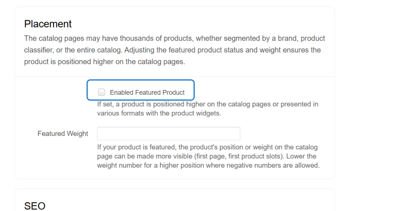 You can also click on the item or product in question to edit it This will take you into the product detail page where you will find an option to edit the placement of the item. Down in the area where it says "Placement" you'll again find a Featured checkbox, here you'll also find Featured Weight. Featured weight is how you can sort the order of the Featured items. You'll enter a number for the weight, we suggest starting at 0 for your top item, then adding your second item at 10, your third item at 20, fourth at 30, incrementing by 10 each time. The reasoning here is that if you want to change the order again at a later time and add something to the middle of the list, there's less items you'll have to edit to get the ordering correct. Once you've updated these fields be sure to click Save.