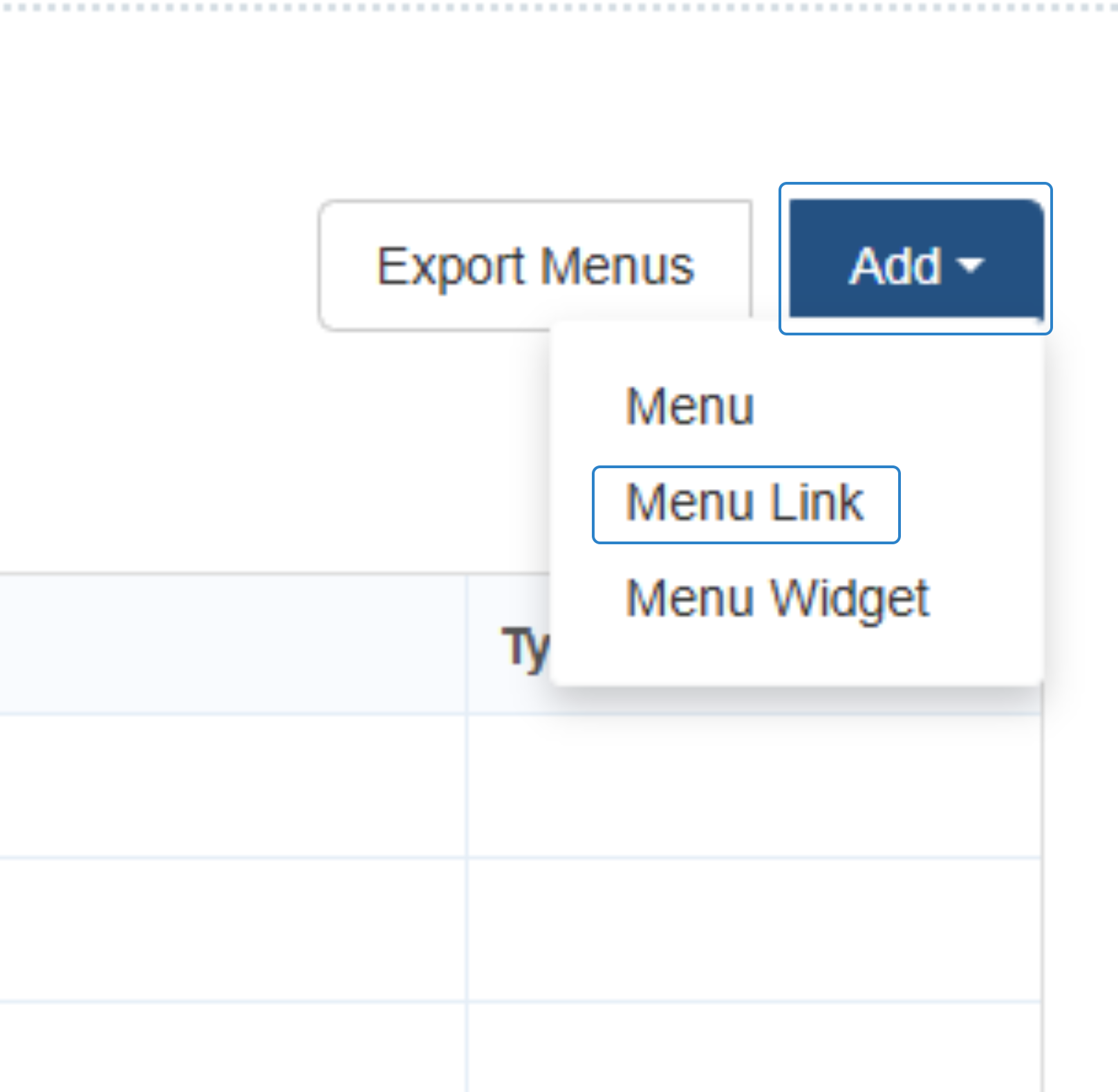 1. From the menu page, to add a new menu item you would click on "Add" and then "Menu Link" from the right side of the page.